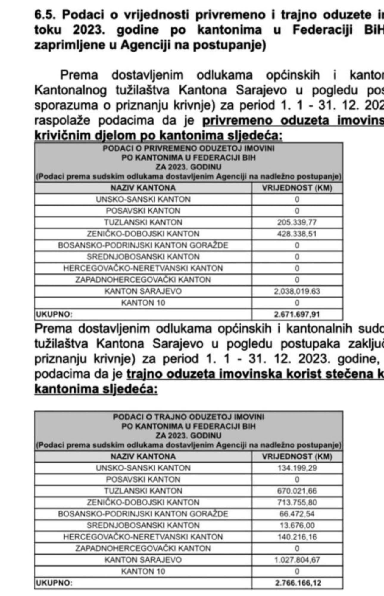 Od toga je 2 miliona KM oduzeto od osumnjičenih u Kantonu Sarajevo, 428 hiljada u Zeničko-dobojskom kantonu, 205 hiljada u Tuzlanskom kantonu.