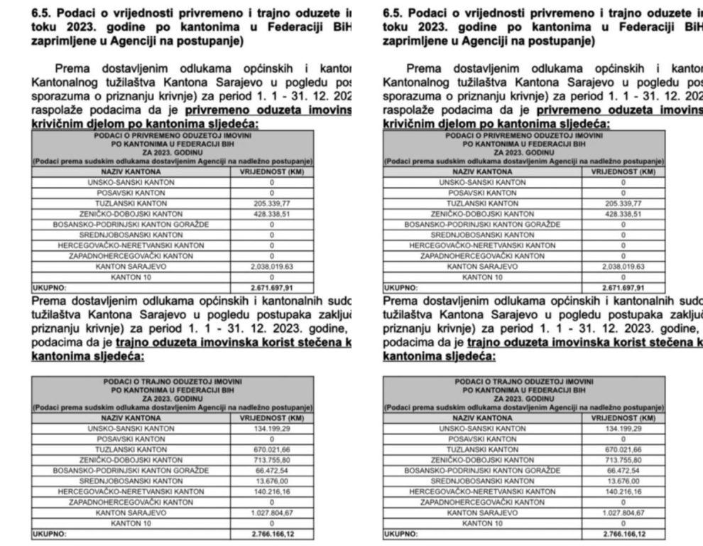 Kada je u pitanju trajno oduzeta imovina u krivičnim postupcima – u Federaciji je ukupno oduzeto 2,7 miliona KM. Od toga je jedan milion oduzet u Sarajevu, 713 hiljada u Zenici, 670 hiljada u Tuzli. Dakle, u ova tri kantona sa sa bošnjačkom većinom pravosuđe je oduzelo 2,3 miliona KM od ukupno 2,7 miliona u cijeloj Federaciji.