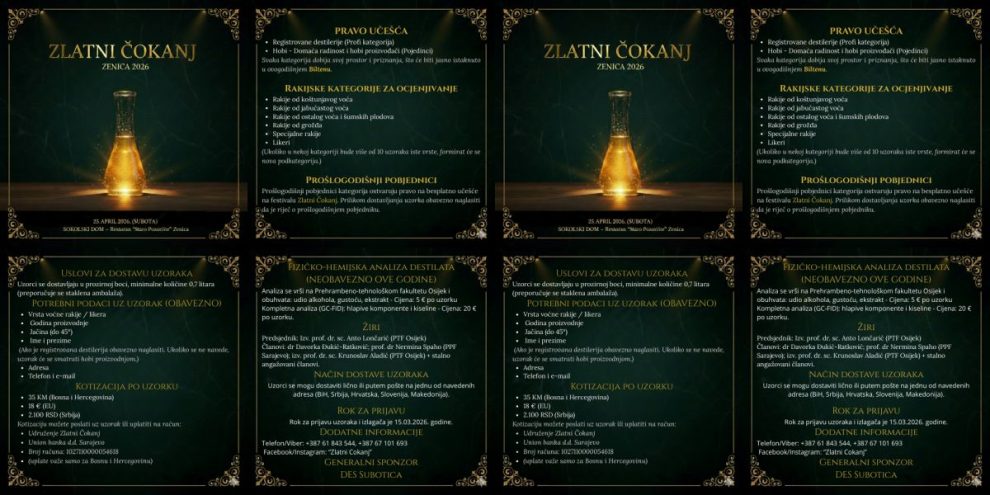 Osmi Međunarodni festival jakih alkoholnih pića i likera „Zlatni Čokanj 2026“ bit će održan u subotu, 25. aprila u Zenici, u prostoru Sokolskog doma – restorana Staro pozorište, s početkom u 17 sati.