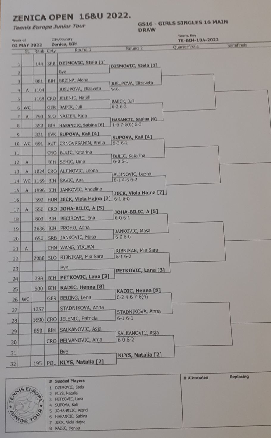 Prva nositeljica turnira je Srbijanka Stela Džimović, a druga Poljakinja Natalia Klys, koja su jučer bile slobodne. Klys će danas od 11,30 sati igrati protiv Zeničanke Salkanović. U konkurenciji dječaka, prvi nositelj je Paolo Angeli iz Slovenije, a drugi David Bakonyi iz Mađarske.