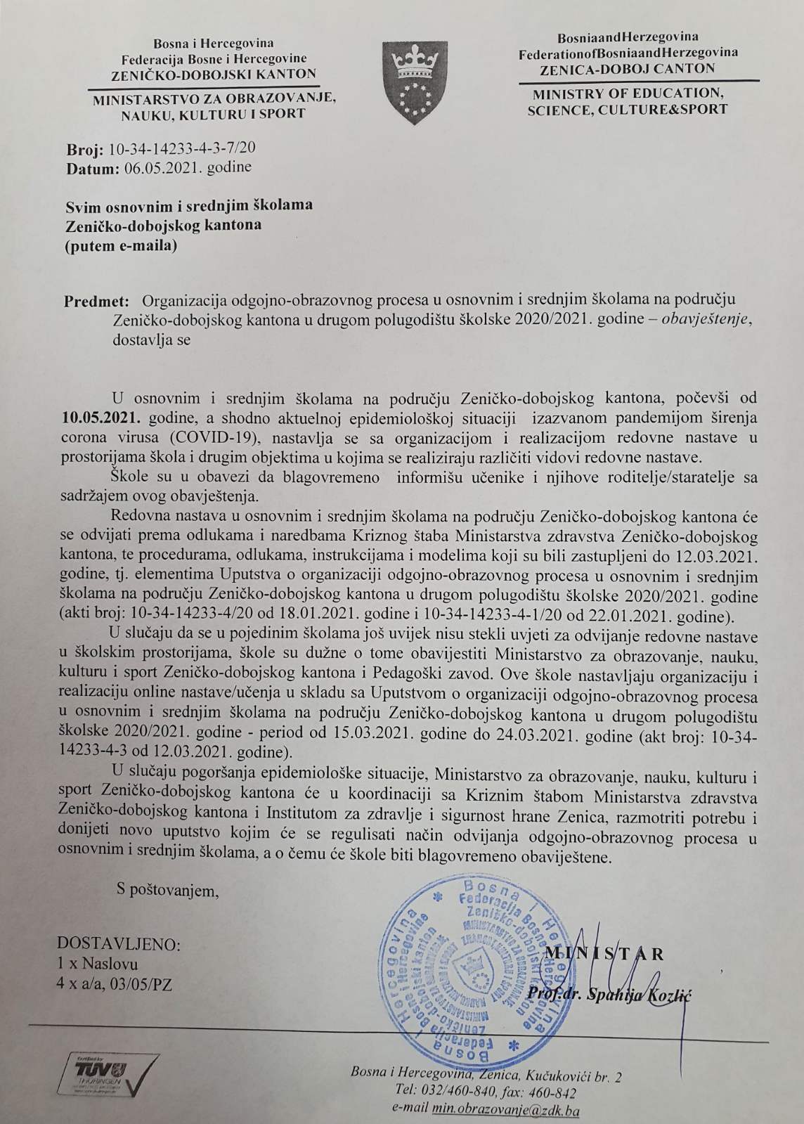 U skladu sa preporukom Ministarstva zdravstva Zeničko-dobojskog kantona i Vlade ZDK Ministarstvo obrazovanja, nauke, kulture i sporta ZDK je odlučilo da se dodatno popuste epidemiološke mjere i postepeno počnu vraćati učenici u školske klupe.