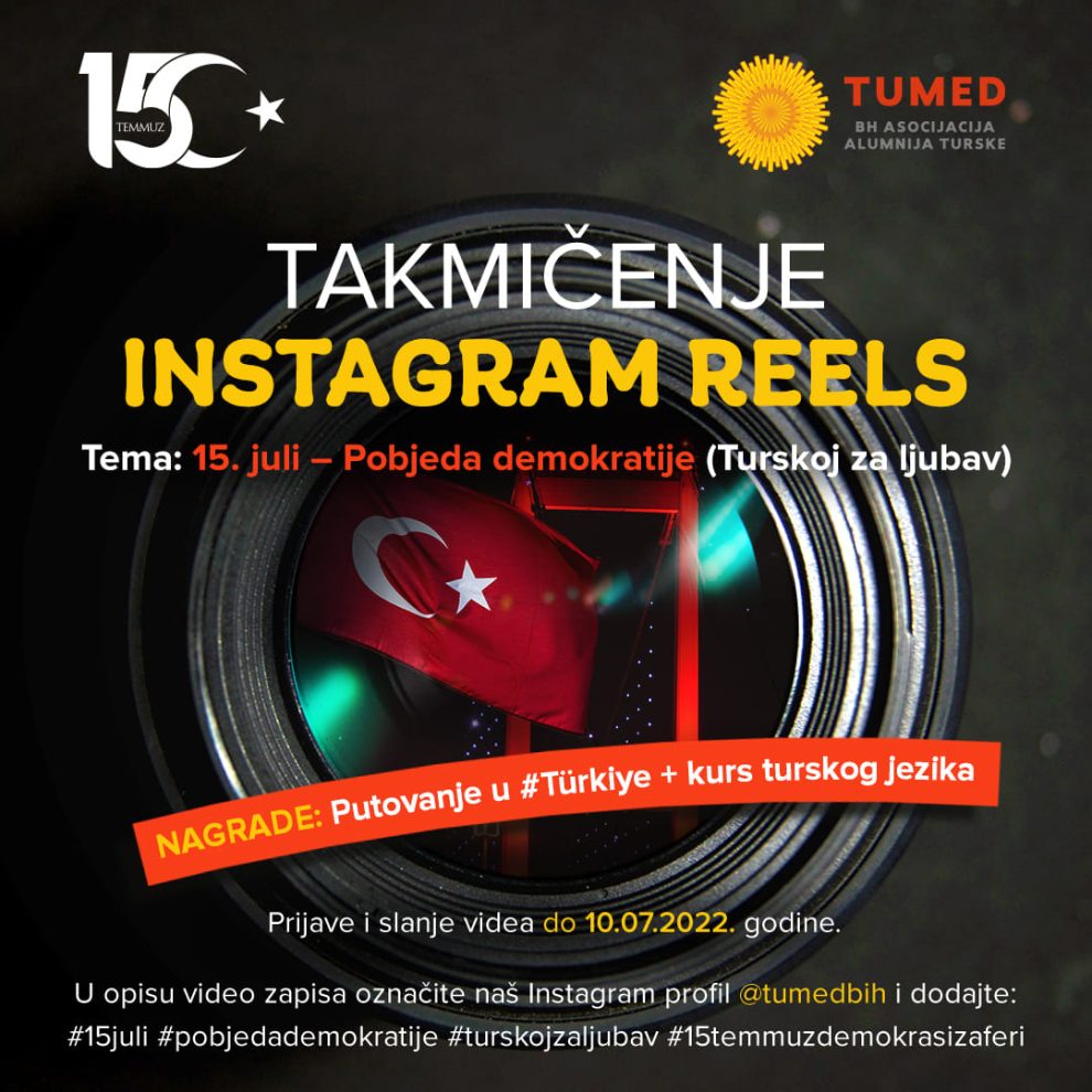 BH Asocijacija turskih alumnija povodom obilježavanja godišnjice pokušaja vojnog udara u Republici Turskoj organizuje takmičenje na Instagramu sa ciljem širenja svijesti i poruka o važnosti demokratije, herojstvu koje je pokazao turski narod, te opasnosti koja se krije iza terorističke organizacije FETO. Bosna i Hercegovina kao prijateljska zemlja se među prvima solidarisala sa Republikom Turskom i njenim narodom, šaljući jasnu poruku da ne postoji alternativa demokratskom političkom poretku. Učesnici takmičenja su slobodni izraziti svoj stvaralački i umjetnički talenat na željeni način, a u skladu sa opće prihvaćenim etičkim i društvenim normama. Svi takmičari koji svoje snimke objave najkasnije do 10. jula 2022. godine u 23:59 sati imaju pravo učešća na takmičenju. Nakon što objave svoje radove, takmičari se porukom trebaju javiti @tumedbih i dostaviti svoje kontakt podatke: Ime i prezime, godište i kontakt telefon. Pobjednici će biti izabrani od strane stručnog žirija. Proglašenje pobjednika će biti najkasnije do 15. jula 2022. godine. Učesnici takmičenja se odriču autorskih prava po pitanju korištenja njihovih snimaka od strane TUMED-a na TV, radio, internet i drugim platformama. Izvor: Takmičari mogu preuzeti zvanične audio-vizuelne materijale u vezi sa obilježavanjem godišnjice 15. jula sa sljedećeg linka: https://kurumsal.15temmuz.gov.tr/