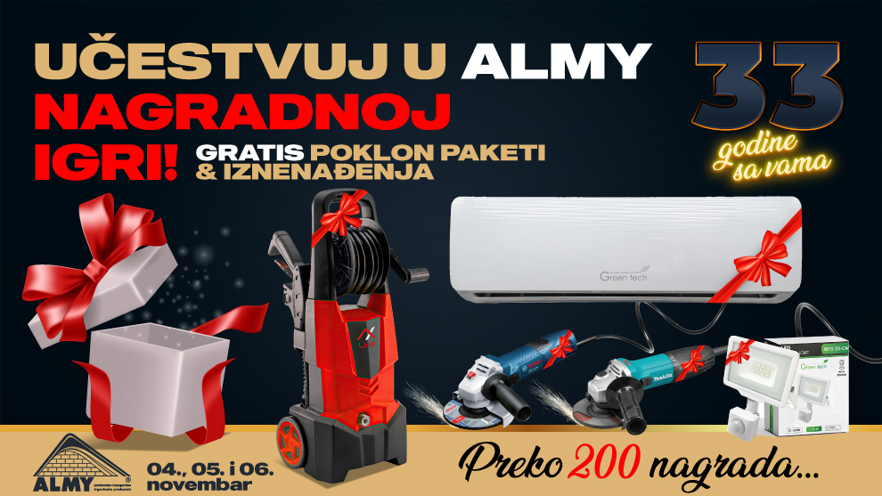Svi kupci koji naprave račun veći od 100KM u Baucentrima ALMY u Zenici i Zavidovićima ili salonu Ceralmyco, 04., 05. i 06. novembra, ostvaruju pravo na učešće u nagradnoj igri!