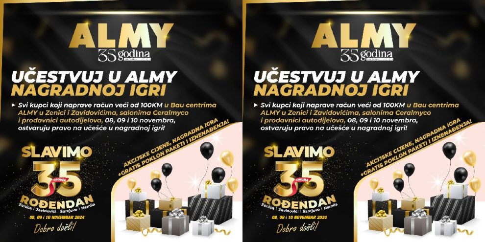 ⭕️ Svi kupci koji naprave račun veći od 100KM u Bau centrima ALMY u Zenici i Zavidovićima, salonima Ceralmyco i prodavnici autodijelova, 08, 09. i 10. novembra, ostvaruju pravo na učešće u nagradnoj igri!