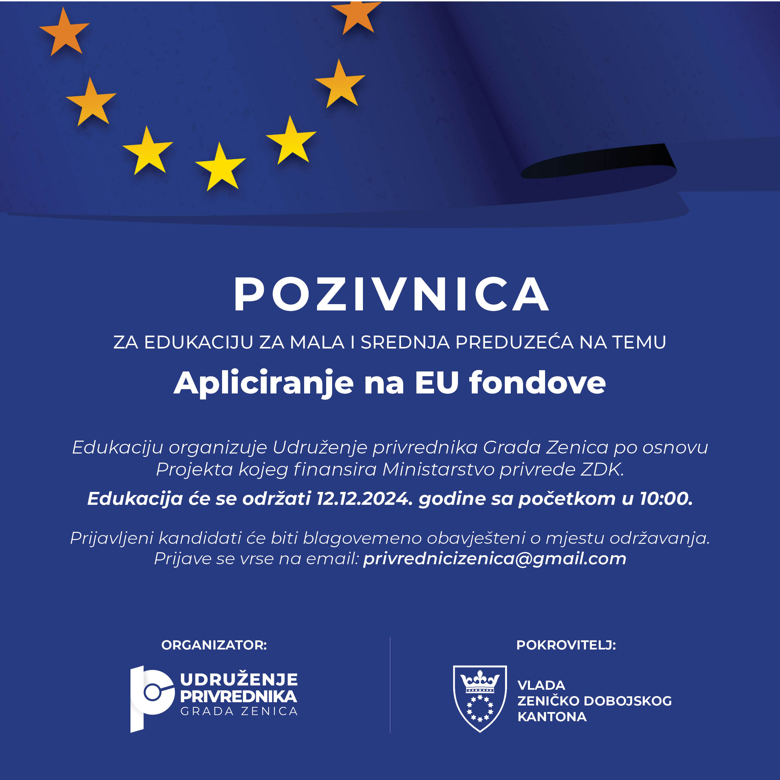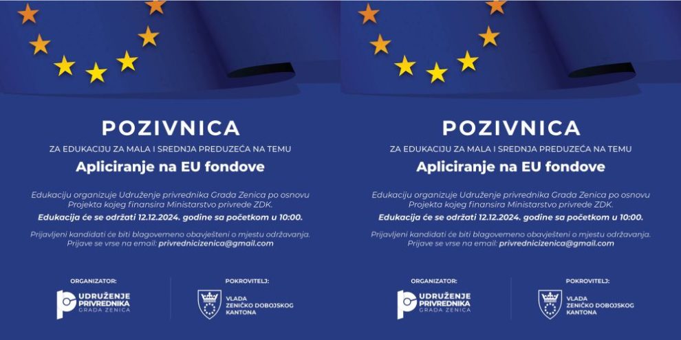 Udruženje privrednika Grada Zenica u sklopu projekta “Privrednici privrednicima – Serija edukacija za mala i srednja preduzeća” u četvrtak, 12.12.2024. godine sa početkom u 10:00 organizuje besplatnu edukaciju na temu “Pisanje EU projekata”.