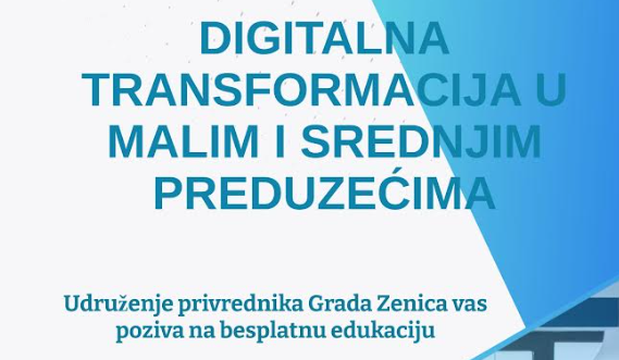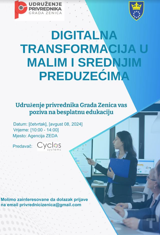 Udruženje privrednika Grada Zenica u četvrtak 08.08.2024. godine sa početkom u 10:00 sati u sali Zeničke razvojne agencije ZEDA organizuje besplatnu edukaciju na temu „Digitalna transformacija u malim i srednjim preduzećima“.