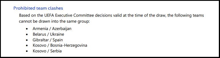 Naime, na osnovu odluke Izvršnog odbora UEFA-e, pojedine zemlje ne mogu biti u istim grupama. Tako je odlučeno da Zmajevi neće moći igrati protiv Kosova. Također, UEFA je donijela odluku da u istoj grupi ne mogu biti Armenija i Azerbejdžan, Bjelorusija i Ukrajina, Gibraltar i Španija, te Kosovo i Srbija.