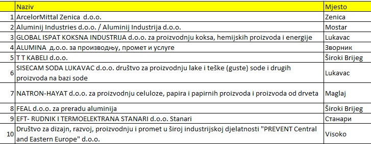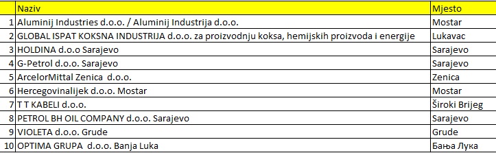 Najveći izvoznik iz Bosne i Hercegovine u prošloj godini bila je kompanija ArcelorMittal Zenica, dok je najveći uvoznik bio Aluminij Industries iz Mostara, rečeno je za BiznisInfo iz Uprave za indirektno oporezivanje BiH. Aluminij Industries je ujedno drugi najveći izvoznik iz naše zemlje u 2021. godini. Na trećem mjestu je Global ispat koksna industrija Lukavac a ne četvrtom je zvornička Alumina. Peti najveći izvoznik lani je bila firma TT Kabeli iz Širokog Brijega, šesti Sisecam soda Lukavac.