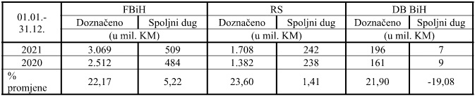 U tablici ispod dajemo prikaz ukupno raspoređenih sredstava entitetima i Distriktu Brčko BiH sa pripadajućim vanjskim dugom za period januar – decembar 2021. godine u poređenju sa istim periodom prošle godine. Svi iznosi su iskazani u milionima KM.