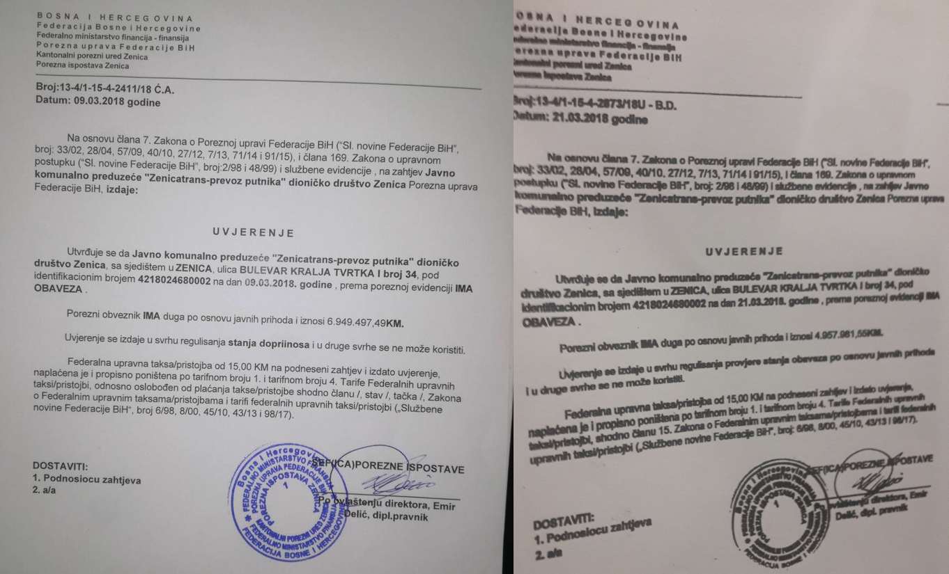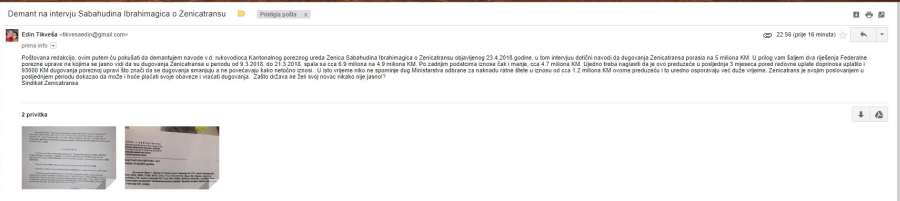 Poštovana redakcijo, ovim putem ću pokušati da demantujem navode v.d. rukovodioca Kantonalnog poreznog ureda Zenica Sabahudina Ibrahimagica o Zenicatransu objavljenog 23.4.2018.godine. u tom intervjuu dotični navodi da dugovanja Zenicatransa porasla na 5 miliona KM. U prilog vam šaljem dva riješenja Federalne porezne uprave na kojima se jasno vidi da su dugovanja Zenicatransa u periodu od 9.3.2018. do 21.3.2018. spala sa cca 6.9 miliona na 4.9 miliona KM. Po zadnjim podatcima iznose čak i manje, cca 4.7 miliona KM. Ujedno treba naglasiti da je ovo preduzeće u posljednja 3 mjeseca pored redovne uplate doprinosa uplatilo i 93000 KM dugovanja poreznoj upravi što znači da se dugovanja smanjuju a ne povećavaju kako netočno iznosi.  U isto vrijeme niko ne spominje dug Ministarstva odbrane za naknadu ratne štete u iznosu od cca 1.2 miliona KM ovome preduzeću i to uredno osporavaju već duže vrijeme. Zenicatrans je svojim poslovanjem u posljednjem periodu dokazao da može i hoće plaćati svoje obaveze i vraćati dugovanja.  Zašto država ne želi svoj novac nikako nije jasno!?