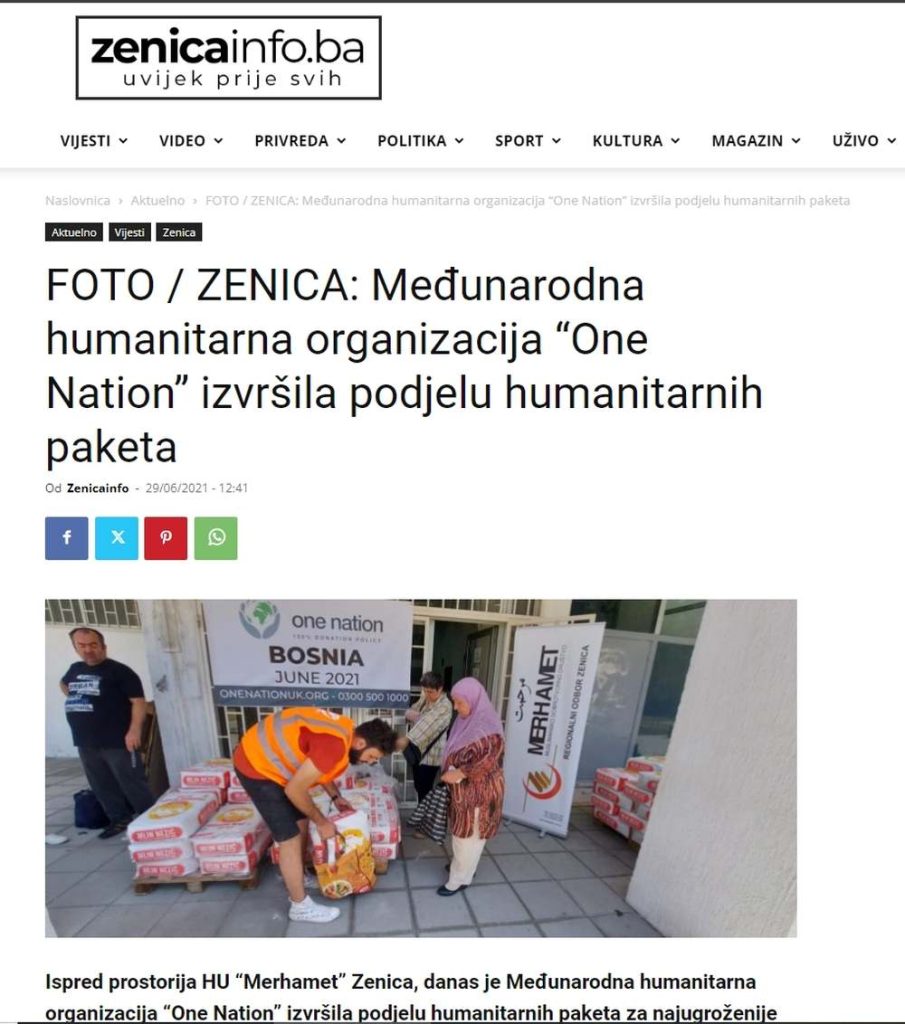 Britanska organizacija ONE NATION je zvanično registrovana u Registru humanitarnih organizacija Ujedinjenog kraljevstva Velike Britanije i Sjeverne Irske, o čemu je dokaz lako pronaći NA OVOM LINKU. Čak je i lokalni javni RTV Servis Grada Zenice, RTV Zenica, dakle medij pod punom kontrolom Gradske uprave i Gradonačelnika, više puta izvještavala o njihovom radu u BIH, a samo jedna od primjera je NA OVOM LINKU.