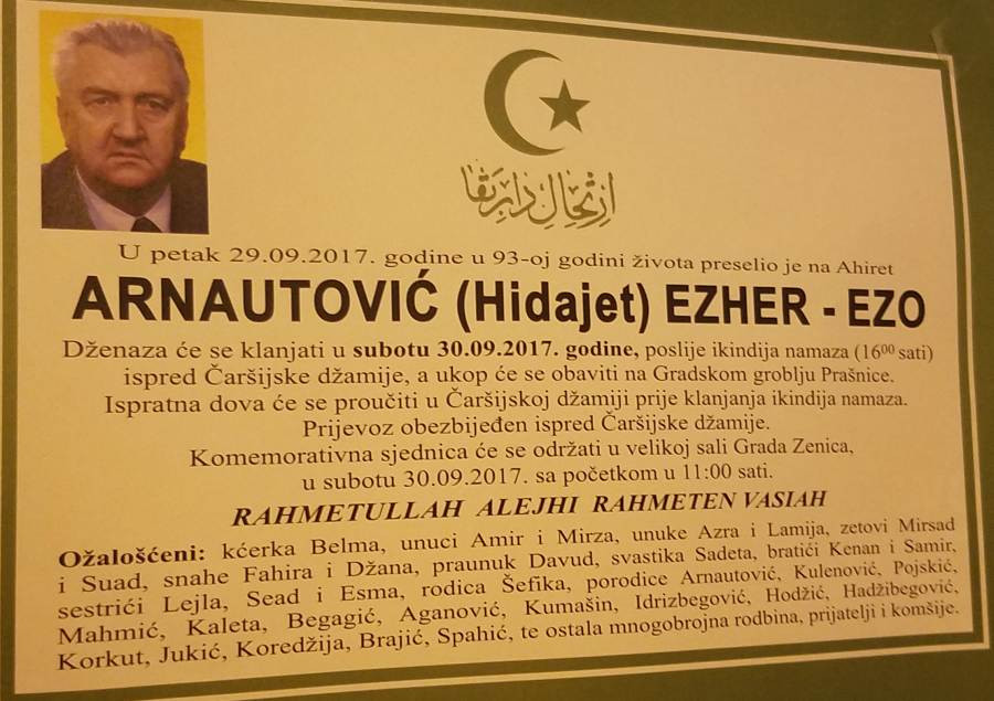 Umro Ezher Ezo Arnautović, komemoracija u Velikoj sali Grada Zenica u subotu u 11 sati – Prijeratni predsjednik Skupštine Opštine Zenica, u ratu pomoćnik komandanta 3.korpusa Armije BiH, Ezher Ezo Arnautović, preminuo je jutros u Zenici, saznaje Zenicablog.