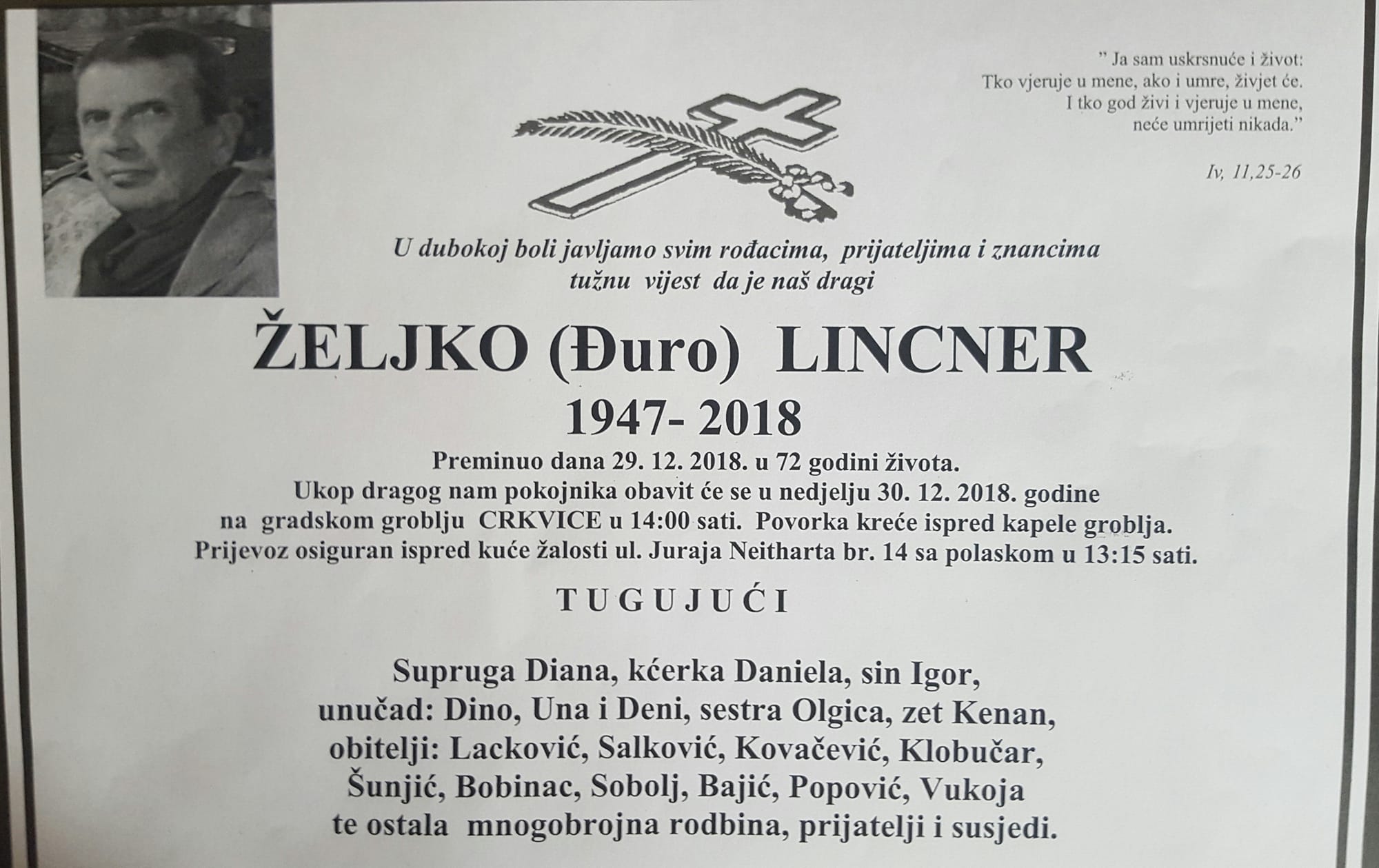Sahrana Željka Lincnera će biti obavljena na Gradskom groblju Crkvice u Zenici, u nedjelju u 14 sati.