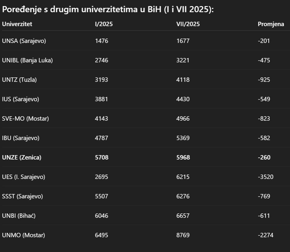 Poređenje s drugim univerzitetima u BiH (I i VII 2025):