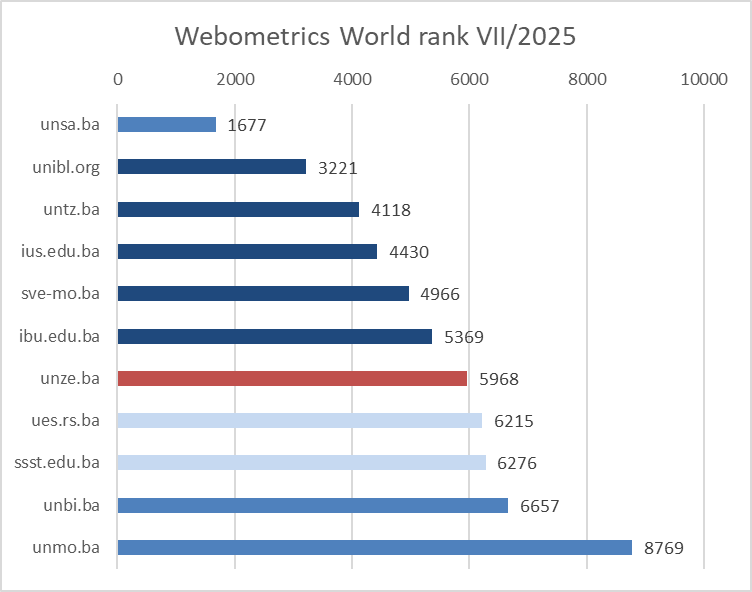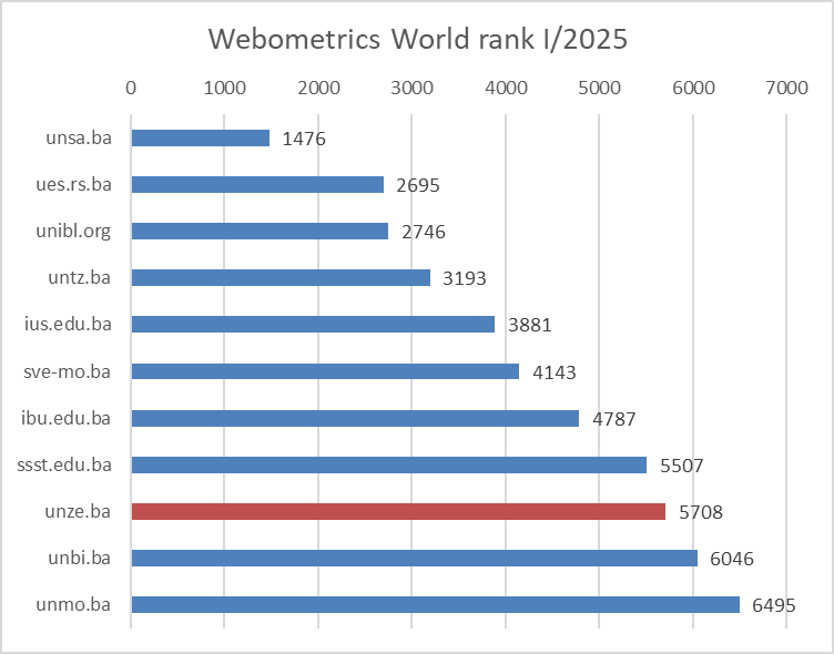 UNZE je trenutno 7. od 11 univerziteta iz BiH koji se nalaze na Webometrics listi, što je prividno poboljšanje u poretku. Međutim, ovo nije rezultat stvarnog unaprjeđenja digitalnog prisustva, naučnog rada ili vidljivosti, već posljedični „napredak“ zbog težeg kolapsa drugih institucija. Pad sa 5708. na 5968. poziciju u svijetu znači da se sve više univerziteta globalno razvija i postaje vidljivije, dok UNZE stagnira. U trenutku kada se digitalna transformacija i otvoreni pristup znanju ubrzavaju, ovakvi rezultati ukazuju na nedostatak strateškog razvoja u oblasti digitalne infrastrukture, naučne produkcije i međunarodne saradnje.