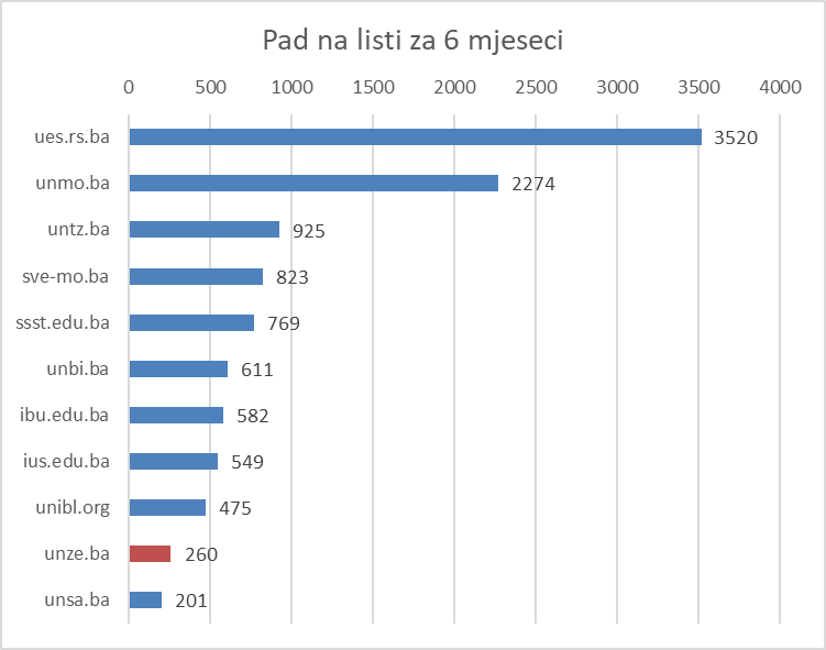 Najveći pad u BiH zabilježio je Univerzitet u Istočnom Sarajevu – čak 3520 mjesta niže nego u januaru. Slijedi UNMO sa padom od 2274 pozicije.