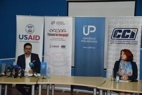 UPFBiH predstavio dosadašnje rezultate projekta “Poslovanje bez korupcije”- Cilj projekta „Poslovanje bez korupcije“ kojeg provodi Udruženje poslodavaca Federacije Bosne i Hercegovine jeste doprinijeti smanjenju prostora za koruptivne radnje nosilaca izvršne i zakonodavne vlasti, kao i izloženosti poslodavaca korupciji, istaknuto je na press konferenciji na kojoj su predstavljene do sada provedene aktivnosti na realizaciji ovog projekta. Aktivnosti se odnose na izmjenu postojeće legislative koja potiče korupciju, uspostavu javnih registara, uspostavu web platforme za prijavu korupcije i besplatnu pravnu pomoć te pružanje svih neophodnih informacija poslodavcima.
