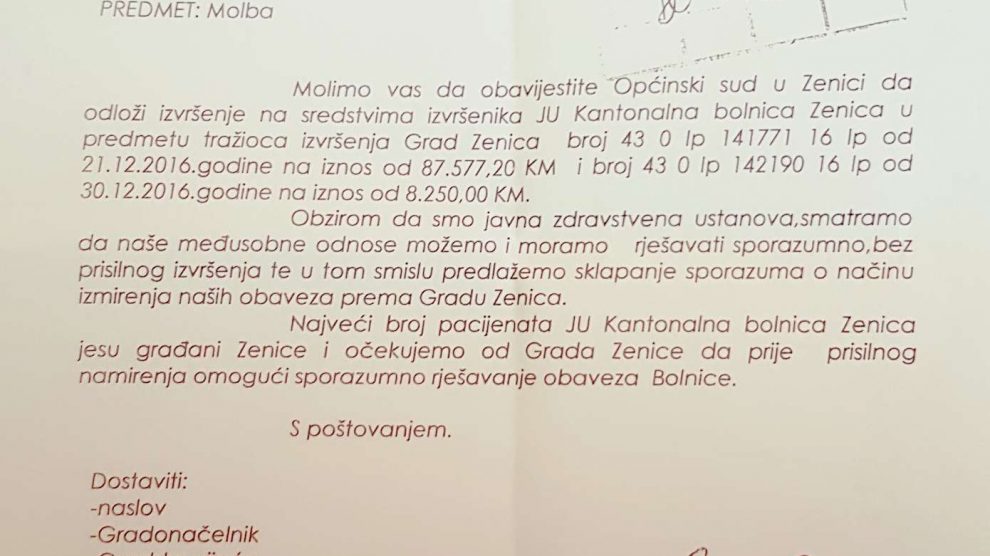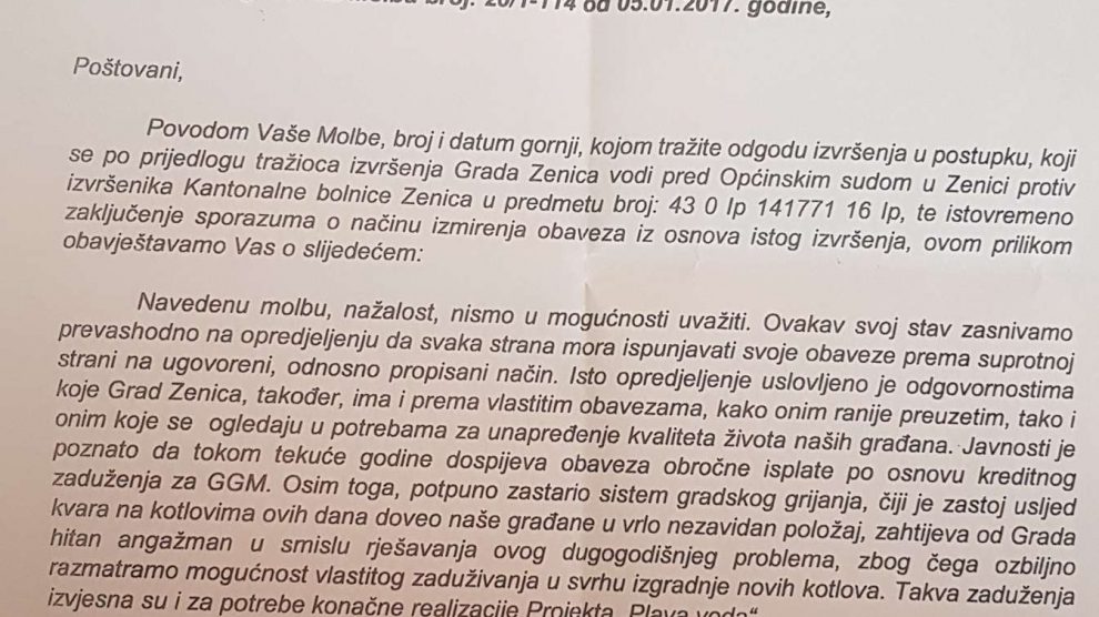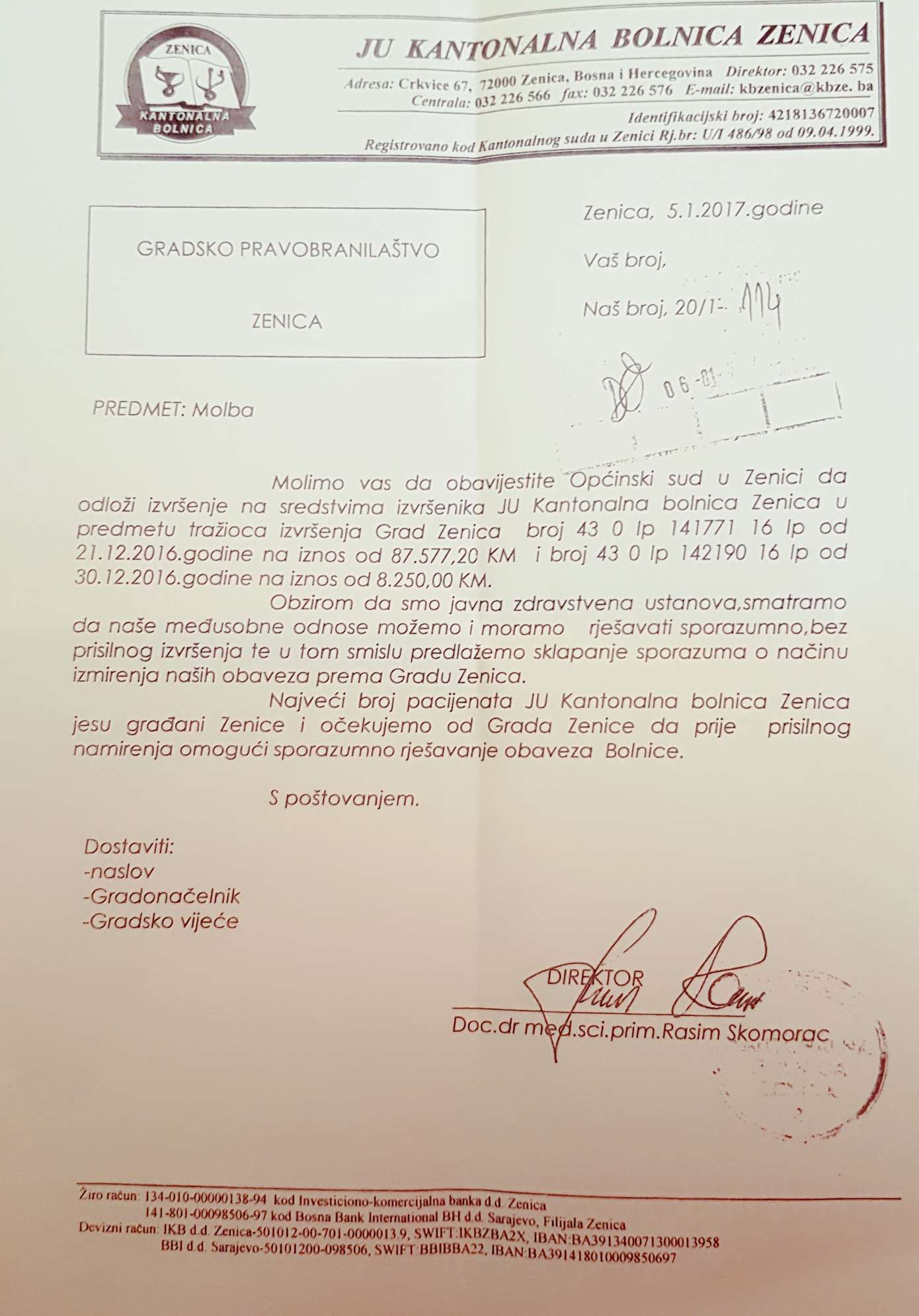 Uprava Bolnice je bila u pravu, gradonačelnik je ipak odbio dogovor oko plaćanja u ratama- Proteklih dana javnost u Zenici i BiH je bila zabrinuta zbog situacije sa blokadom računa Kantonalne bolnice Zenica, najveće zdravstvene ustanove u Zenici. Pale se teške riječi, međusobna optuživanja, a na kraju je javnost bila zbunjena količinom žući i riječi izrečenih u medijskom prepucavanju. Najbitnije, račun je početkom ove sedmice deblokiran i funkcionisanje ove ustanove je nastavljeno.