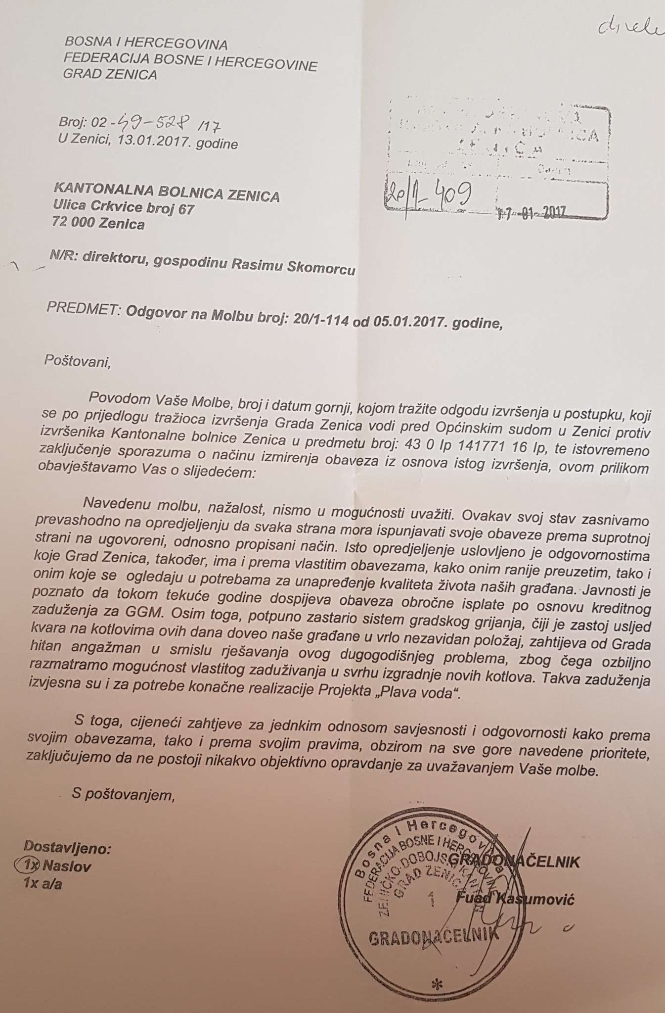 Zenicablog je došao u posjed dokumenata koji pokazuju ko je bio u pravu. Naime, dopisom od 5. januara upućenog preko Pravobranilaštva Gradonačelniku, direktor KBZ Rasim Skomorcem MOLI dogovor i razgovor o dugu. Taman kad smo pomislili da je do gradonačelnika “zalutao” dokument, te da ga on shodno tome nije ni vidio, potvrđeno nam je da je KBZ osam dana kasnije, 13. januara, Kasumović uputio odgovor Skomorcu, u kojem navodi dio razloga zbog kojih ne prihvata “plaćanje u ratama”. Dio tih navoda ponovio je nepuna dva mjeseca kasnije, kad je afera izašla u javnost, ali im je dodao i lične razloga zbog kojih ne vjeruje menadžmentu KBZ.