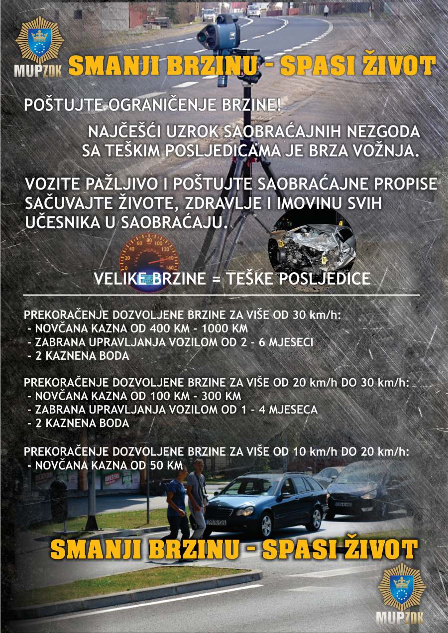 U nastavku naznačenih aktivnosti, koje se poduzimaju u okviru Operativnog plana na poboljšanju bezbjednosti saobraćaja, planirana je i zavedena kampanja pod sloganom “SMANJI BRZINU-SPASI ŽIVOT”, koja će se u narednih mjesec dana sprovoditi na svim putevima na području Zeničko-dobojskog kantona.