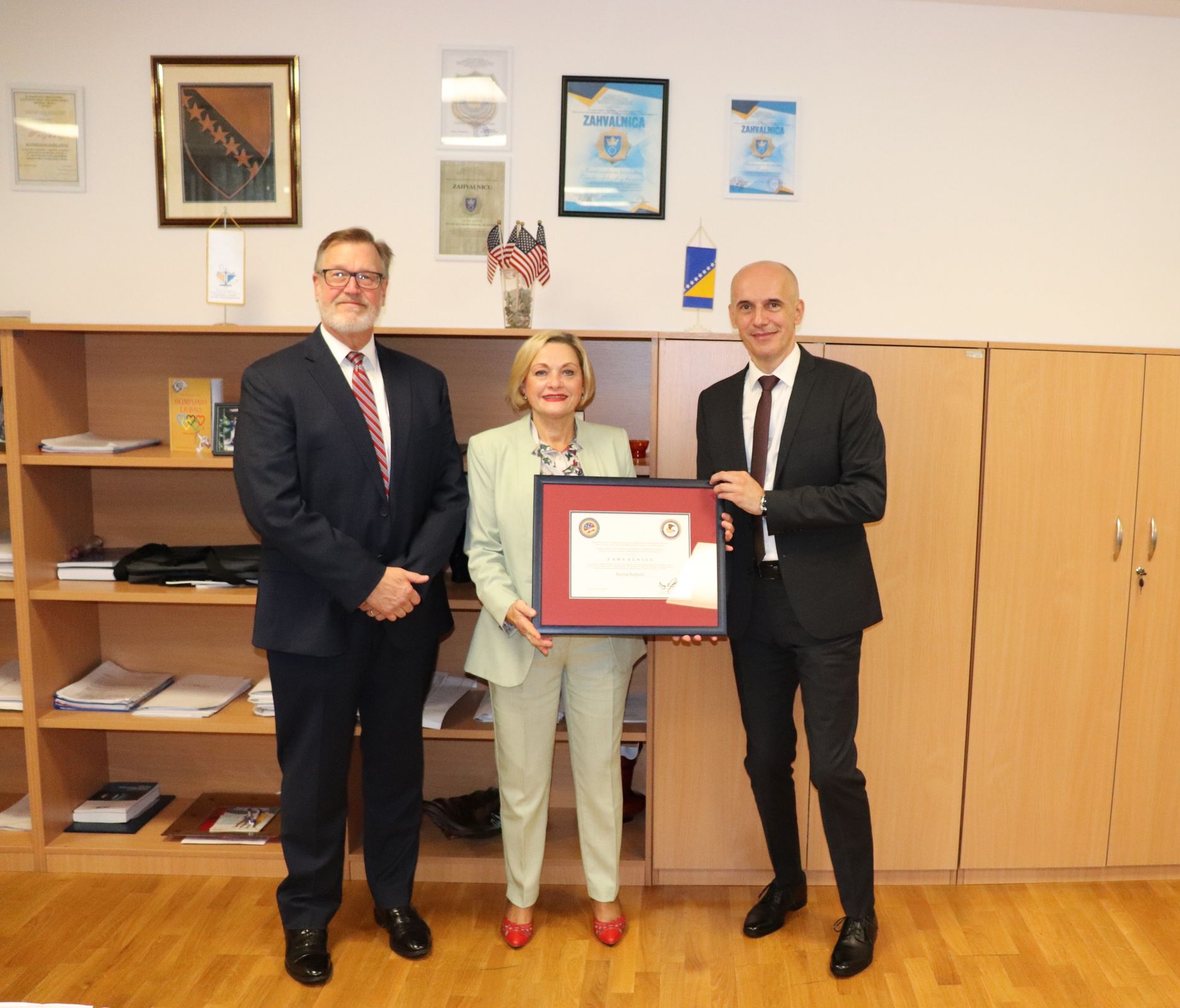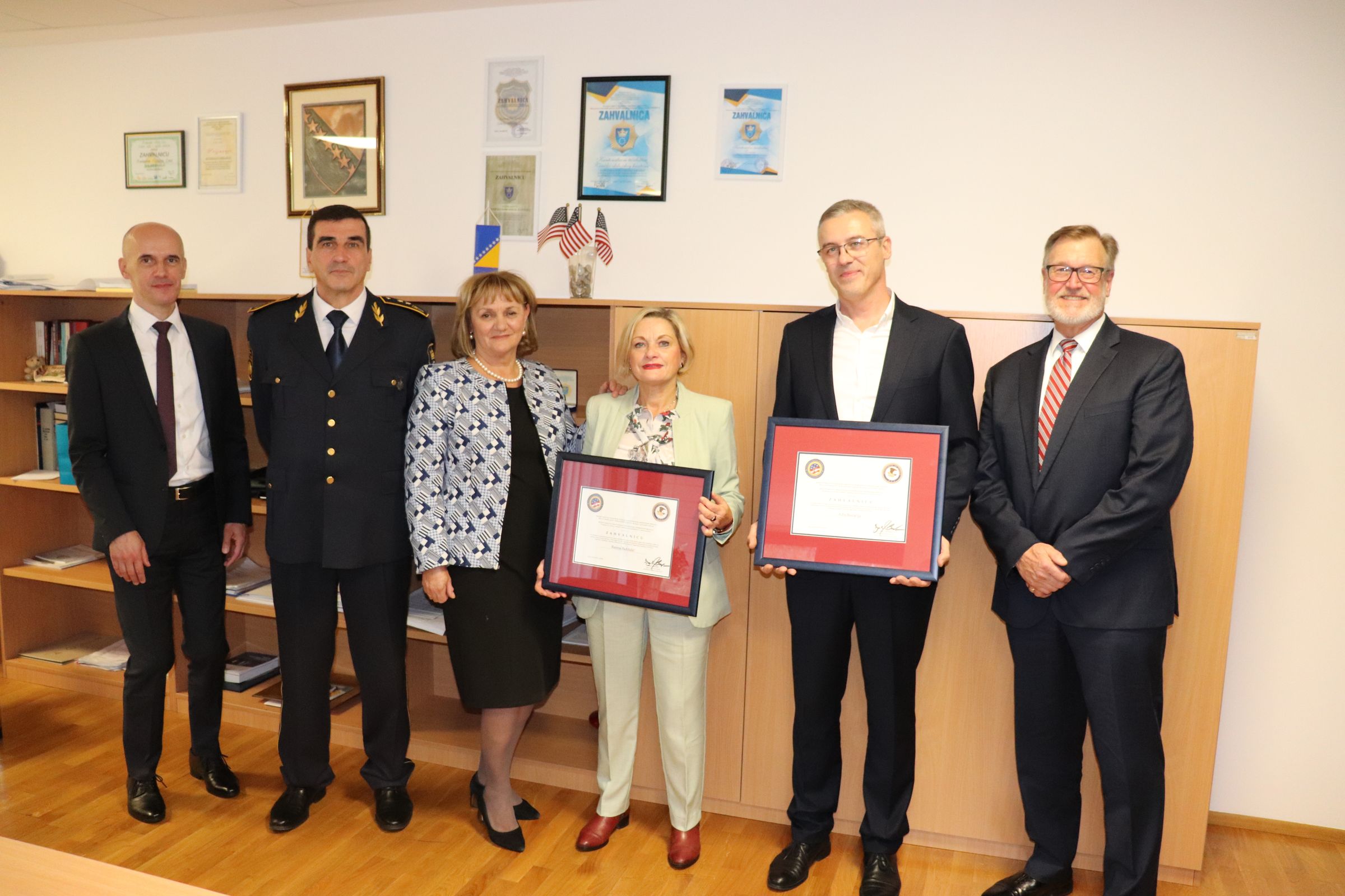 Zahvalnica je dodijeljena od strane Ministarstva vanjskih poslova Sjedinjenih Američkih Država-Biro za borbu protiv međunarodne trgovine drogom i provedbu zakona, kao i Ministarstva pravosuđa Sjedinjenih Američkih Država -Program za razvoj, pomoć i edukaciju tužilaštava u inostranstvu, čime se kroz praćenje i priznavanje konkretnih rezultata, podržavaju napori Bosne i Hercegovine da ispuni minimalne standarde za eliminiranje trgovine ljudima sukladno Zakonu o zašiti žrtava trgovine ljudima.