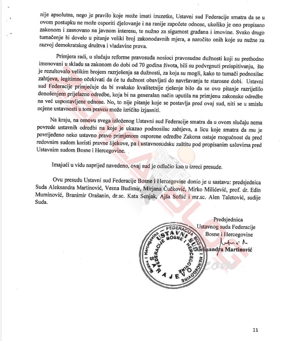 Ovu presudu Ustavni sud Federacije Bosne i Hercegovine donio je u sastavu: predsjednica Suda Aleksandra Martinović, Vesna Budimir, Mirjana Čučković, Mirko Miličević, prof. dr. Edin Muminović, Branimir Orašanin, dr.sc. Kata Senjak, Ajsa Softić i mr.sc. Alen Taletović, sudije Suda.