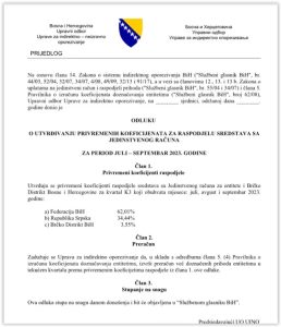 Prema prijedlogu, koji je Klix.ba ranije objavio povećan je koeficijent za Republiku Srpsku na 34,44% pa bi taj entitet u narednom periodu trebao dobiti oko 60 miliona KM više nego kod prethodne raspodjele.