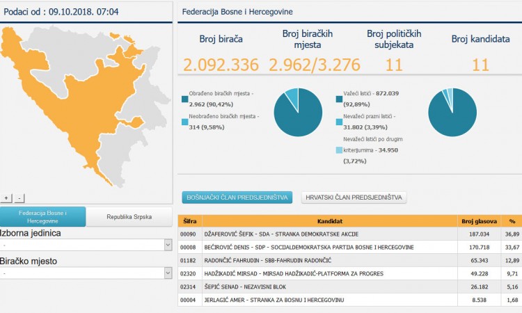 Utorak ujutro: pogledajte ažurirane rezultate CIK-a za Izbore 2018. za BiH, FBiH i Zeničko-dobojski kanton – Jutros su objavljeni novi ažurirani rezultati izbora 2018.
