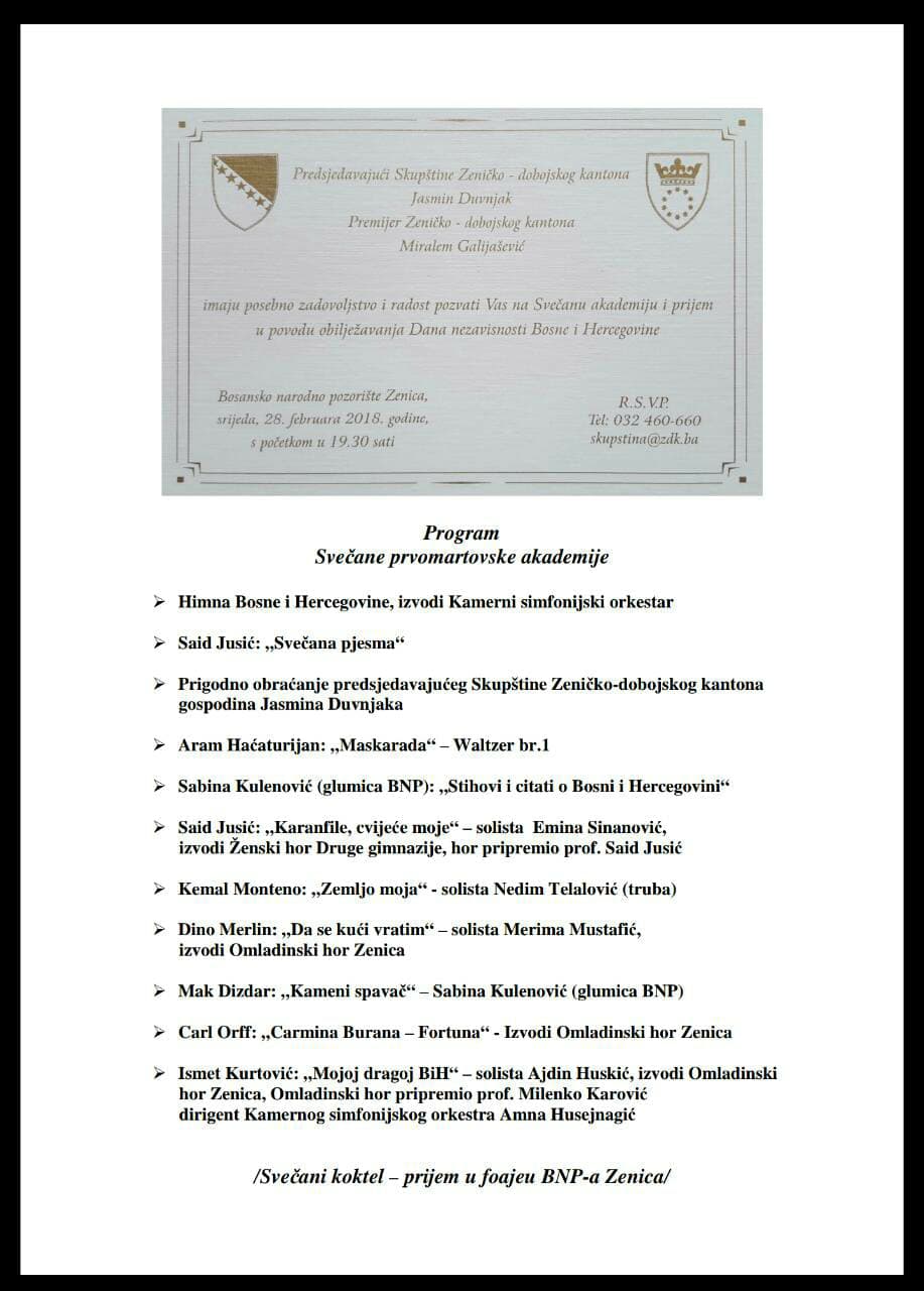 Predsjedavajući Skupštine Jasmin Duvnjak i predstavnici boračkih udruženja, koja će sudjelovati u obilježavanju Dana nezavisnosti BiH, pozvali su sugrađane da u što većem broju prisustvuju obilježavanju ovog datuma. U programima koji se realiziraju na području Zeničko-dobojskog kantona u povodu Dana nezavisnosti Bosne i Hercegovine sudjelovati će  Kamerni orkestar i Omladinski hor iz Zenice.