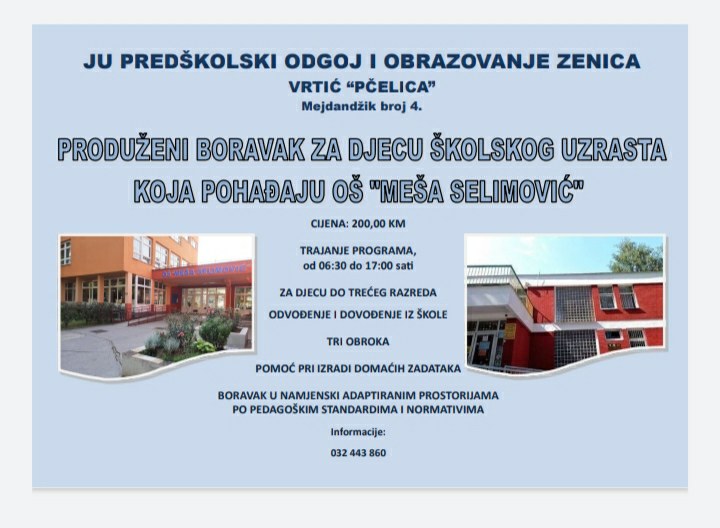 Uveden produženi boravak djece školskog uzrasta u vrtiću ”Pčelica”- JU Predškolski odgoj i obrazovanje Zenica uvodi program Produženog boravka  školske djece u vrtiću “Pčelica” za djecu upisanu u OŠ “Meša Selimović”.