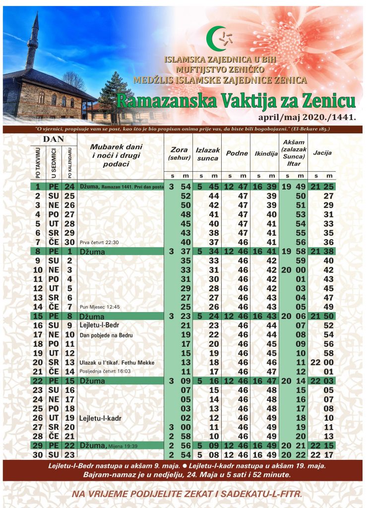 Muftijstvo zeničko – Medžlis Islamske zajednice Zenica objavio je Vaktiju za Ramazan 1441./2020. godine, za područje Grada Zenica. Elektronsku-PDF verziju za printanje možete preuzeti NA OVOM LINKU.