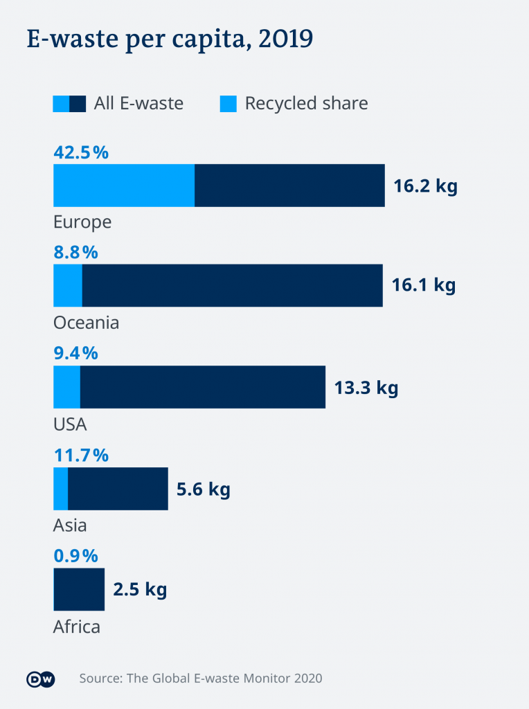 Usprkos tome proteklih godina se manje od petine takvog otpada na pravilan način sakupilo i recikliralo. Jedan dio završava kod posrednika koji ih popravljaju i prodaju onima kojima je dovoljan i rabljeni – ali današnji aparati se sve teže uopće mogu popravljati. A ostatak – završava kojekako i u pravilu na granici zakona. Mnogi se neće niti gnjaviti odlaziti u reciklažno dvorište samo zbog jednog miksera koji je otkazao poslušnost: često će završiti u običnom smeću i tako na deponiju ili će biti spaljen.