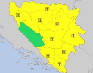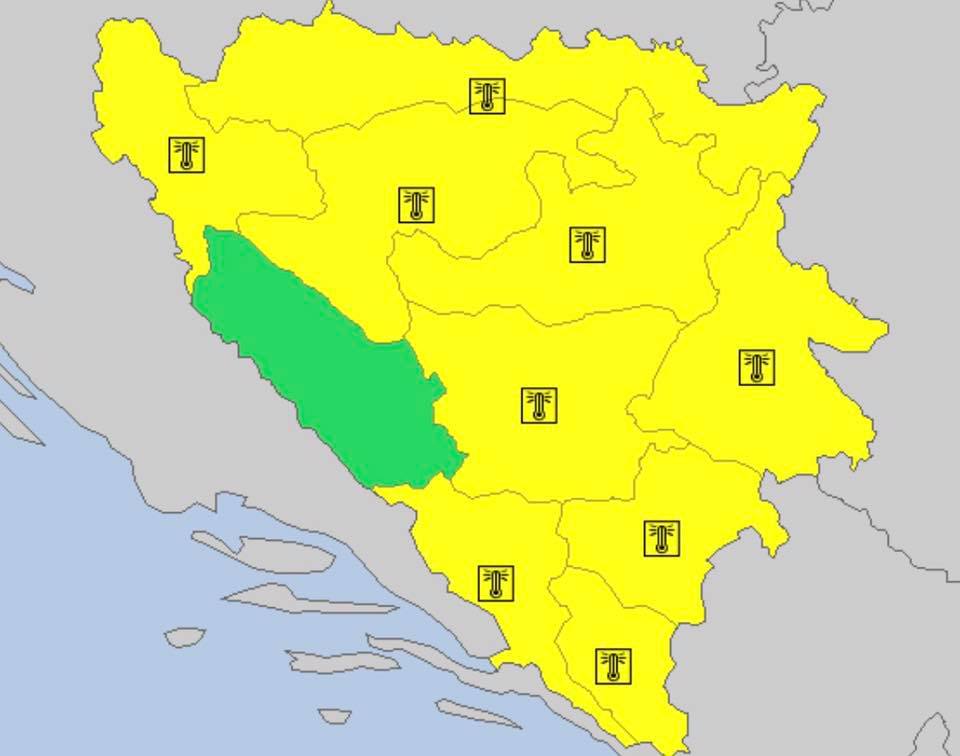 Važno upozorenje meteorologa zbog vremena u BiH – Federalni hidrometeorološki zavoda proglasio je danas žuti meteoalarm za područje Bosne i Hercegovine zbog visokih temperatura zraka. Kako je saopćeno iz ovog Zavoda, do kraja sedmice, kao i tokom iduće (od ponedjeljka do petka) očekuju se visoke dnevne temperature zraka, uglavnom, od 31 do 38 °C. U prvom dijelu naredne sedmice, na sjeveru i jugu naše zemlje, lokalno maksimalne vrijednosti mogu dostizati i vrijednosti do 40°C.