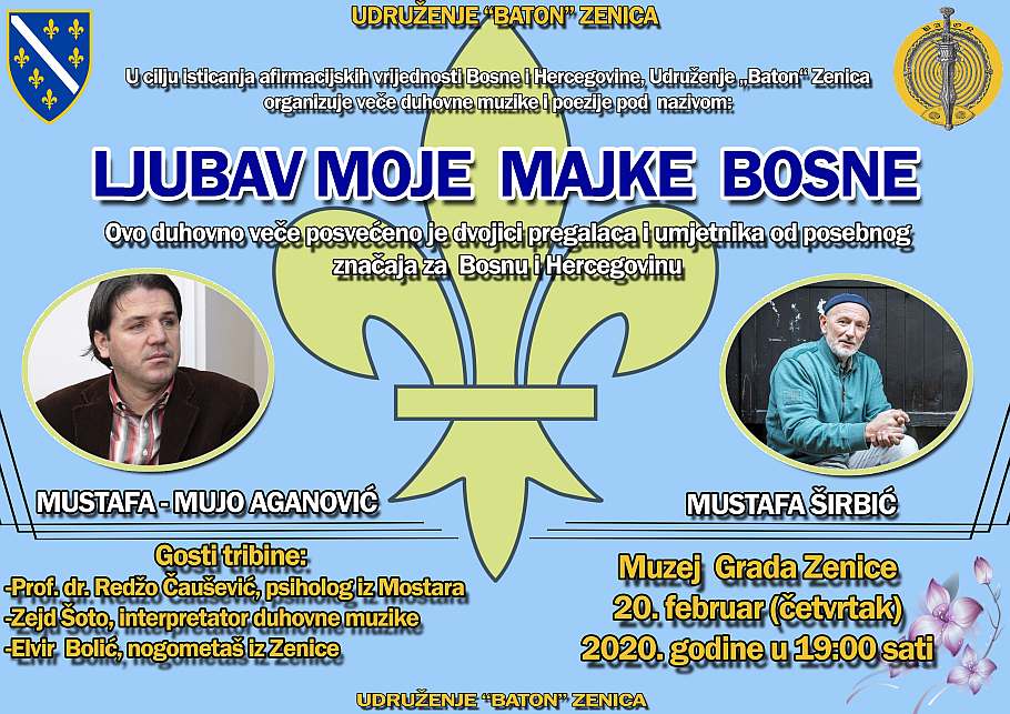 U cilju isticanja vrijednosti i značaja života i djela znamenitih ličnosti i građana Bosne i Hercegovine, Udruženje „Baton“ Zenica organizuje veče duhovne muzike i poezije pod nazivom: