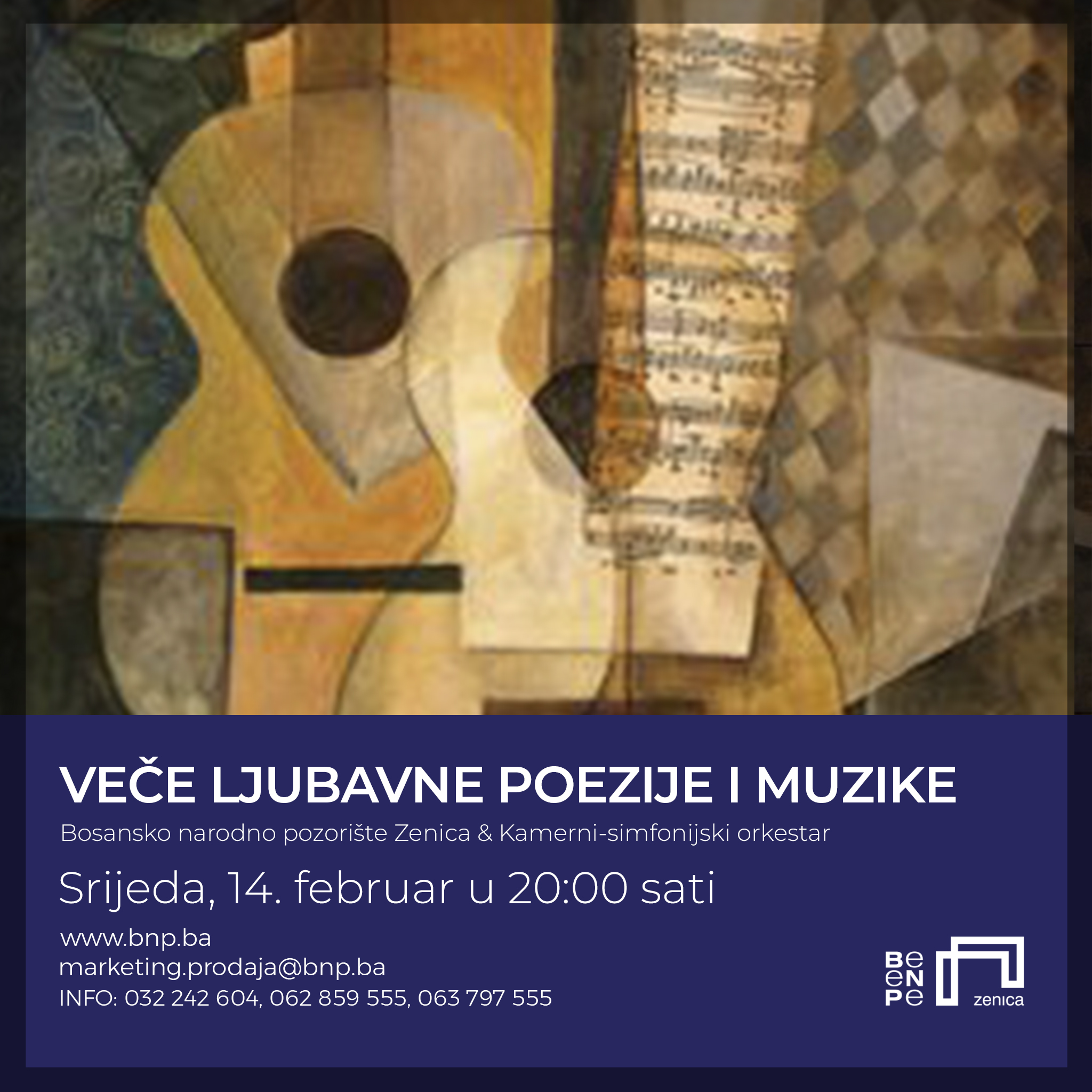 Tu veče će u Zeničkom pozorištu biti izveden izbor najljepše ljubavne poezije i muzike, koju će govoriti članice ansambla Bosanskog narodnog pozorišta Zenica: Lana Zablocki, Ermina Nišić, Adna Kaknjo i Selma Ćosić, a publika će imati priliku da uživa i u muzičkim kompozicijama koje će izvesti članice i članovi Kamernog simfonijskog orkestra iz Zenice. Koncept ove programske aktivnosti potpisuju Nedžma Čizmo i Lajla Kaikčija.