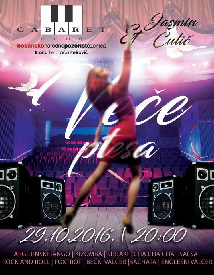 Veče plesa u Cabaret clubu 29. oktobar u 20 sati – Zabavno plesno veče u Cabaret clubu… Pozivamo sve ljubitelje plesa, kako profesionalne, tako i one koji su željni naučiti prve korake tanga, kizombe, sirtakija, cha cha cha, salse, te mnogih drugih vrsta plesa, da dođu 29.10. od 20:00 h u Cabaret club, u zgradi Bosanskog narodnog pozorišta Zenica, na prvom spratu, te uživaju u koracima uz najbolje instruktore…