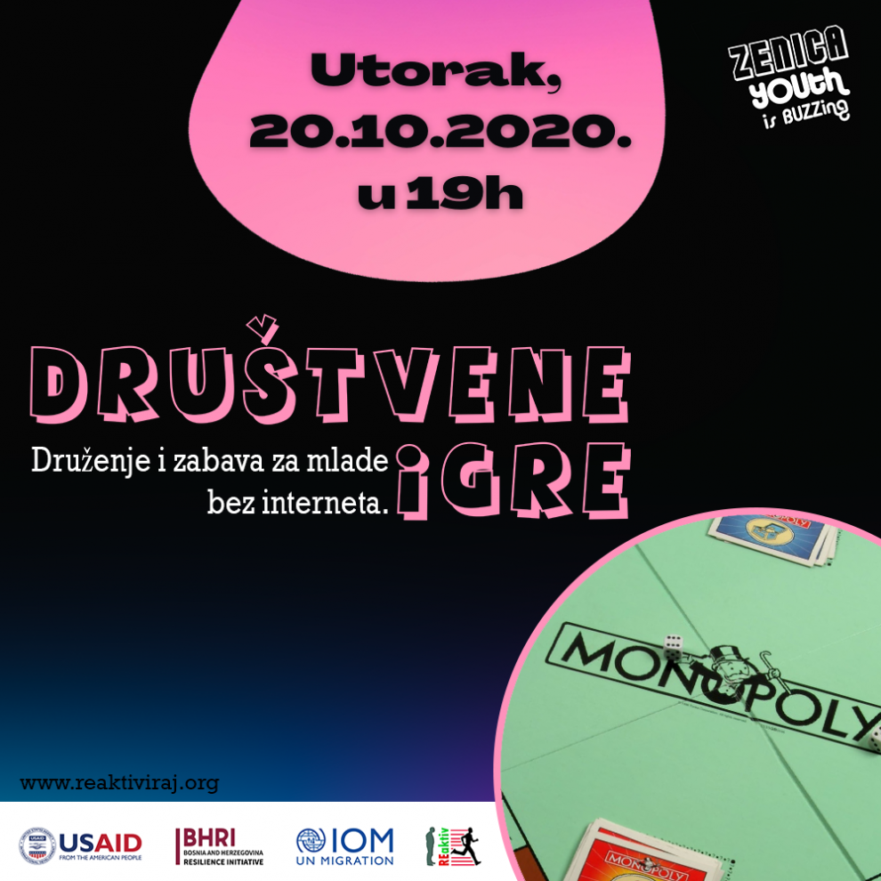 Pozivamo te da sa svojom ekipom dođeš 20.10.2020. od 19:00 sati u Centar za mlade Zenica na Večer društvenih igara, te da zajedno igramo Monopoly, Čovječe ne ljuti se, Riziko, Uno, Alias ili mnogo drugih društvenih igara.