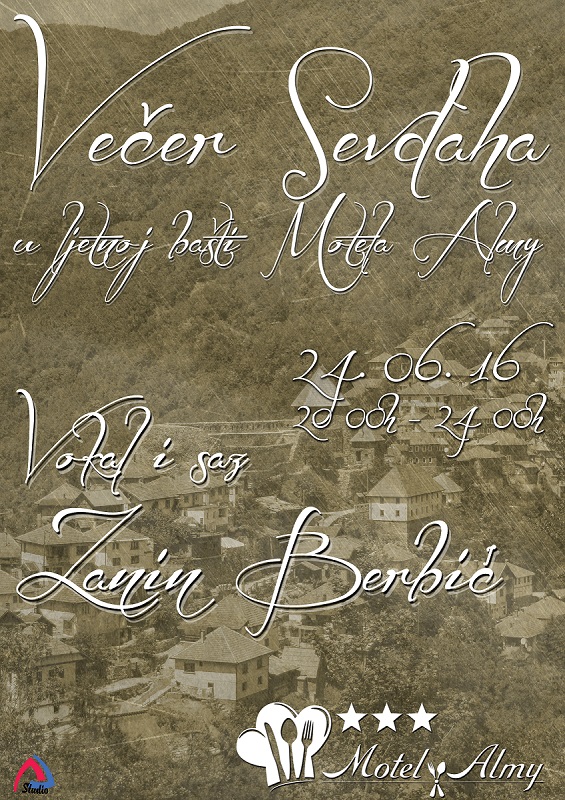 Večer sevdaha-ljetna bašta Motel Almy 24.6. u 20h – Motel Almy u prelijepom ambijentu ljetne bašte organizuje “Večer sevdaha”. “Večer sevdaha” će se održati u petak 24.06.2016. sa početkom u 20:00 sati.