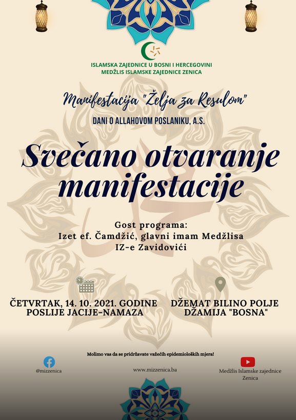 U džematu Bilino Polje će večeras poslije jacije-namaza biti upriličeno svečano otvaranje manifestacije “Želja za Resulom”, uz prigodan program na kojem će gostovati Izet ef. Čamdžić, glavni imam Medžlisa IZ-e Zavidovići i glavni imam Medžlisa IZ-e Zenica mr. Jakub ef. Salkica.