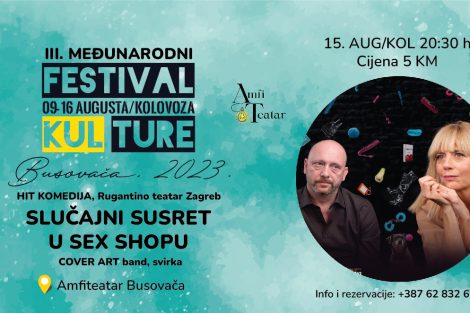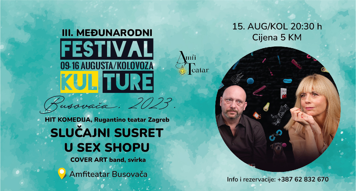 Večeras će u AmfiTeatru na otvorenom u Busovači igrati hit komedija Rugantino Teatra Zagreb „Slučajni susret u sex shopu“ i to 20 sati i 30 minuta. Nakon predstave publiku, na after partiju će zabavlja Cover Art uz najpoznatije Ex Yu hitove. Informacije i rezrvacije ulaznica koje koštaju 5,00 KM moguće je izvršiti na broj telefona 062 832 670, ili kupiti direktno na ulazu u festivalski prostor.