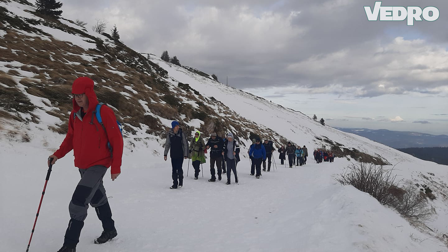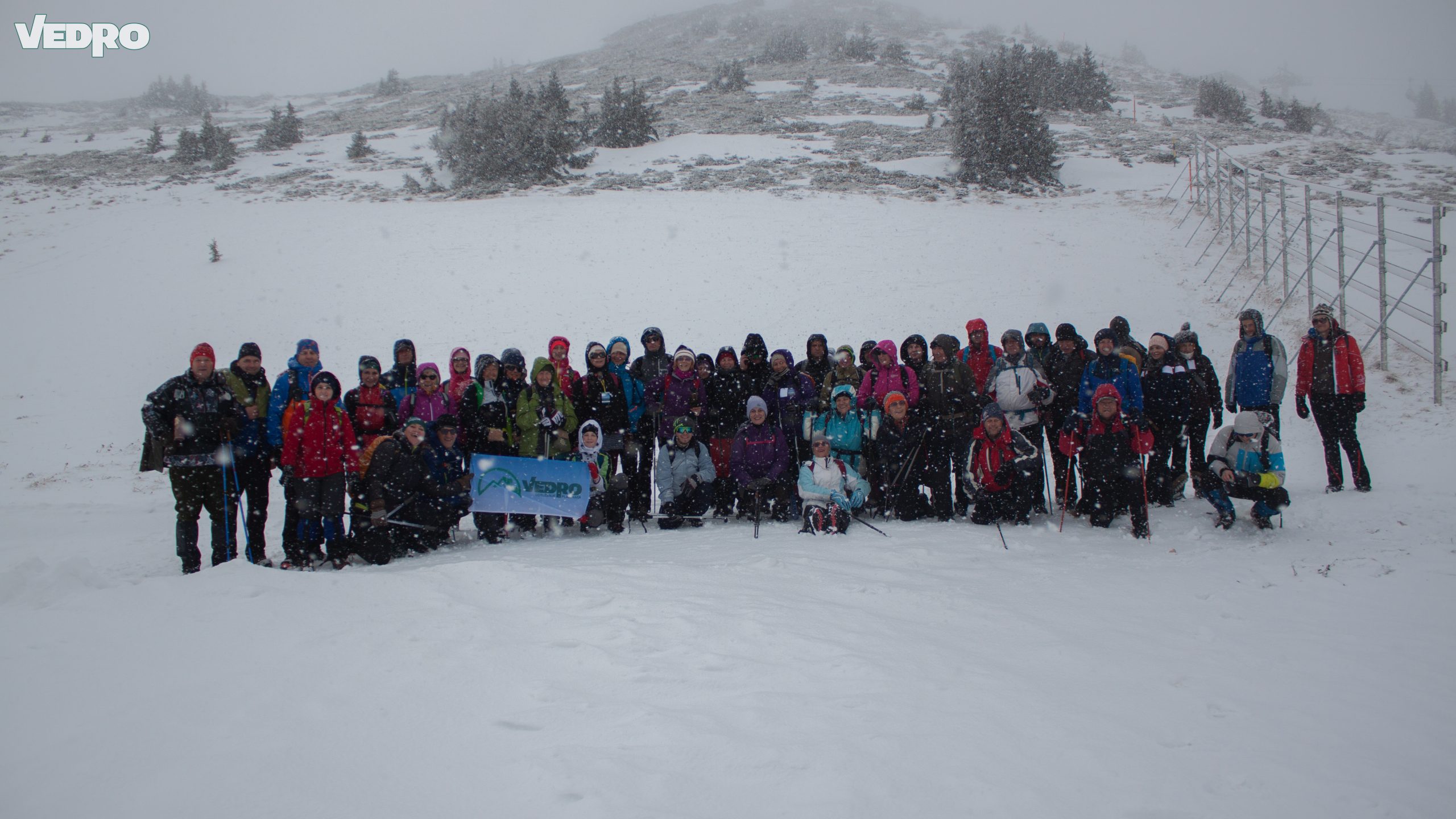 Uz sve te prizore i ljepotu kolona od preko 50 vedraša je neprimjetno brzo došla podno vrha te se sigurnim korakom uspela na vrh Jahorine, Ogorjelica (1916m). Nije nam dopustila da se dugo zadržavamo na vrhu, jak, hladan vjetar nas je već nakon par minuta i par napravljenih fotografija prisilio da se spustimo malo niže u zavjetrinu gdje pravimo kratku pauzu za odmor i jelo. Kako to uvijek biva među planinarima spremnim na sve izazove i iznenađenja raspoloženje je na nivou, piju se kafe, čajevi, jedu sendviči, dijele slatkiši i domaći kolači, prelijepi trenuci i druženje kada smo u ovom modernom vremenu okrenuti jedni drugima. Blago promrzli, ali zadovoljni vraćamo se uz snijeg koji još intenzivnije leprša i prati nas do Rajski vrata, tu gdje nas je dočekao jenjava. Mi se spuštamo prema Rajskoj dolini, a on kovitla nazad i odlazi u njen zagrljaj.
