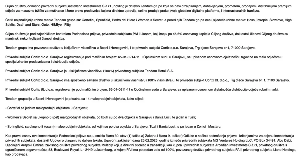 Naime, Konkurencijsko vijeća BiH dopustilo je koncentraciju na tržištu maloprodaje odjeće i obuće u BiH koja nastala sticanjem zajedničke kontrole Multiply Group iz Abu Dabija, zatim kompanije PAI Partners i Llano Holdings iz Luksemburga kupovinom 67,9 posto udjela u kompaniji Castellano Luksemburg.