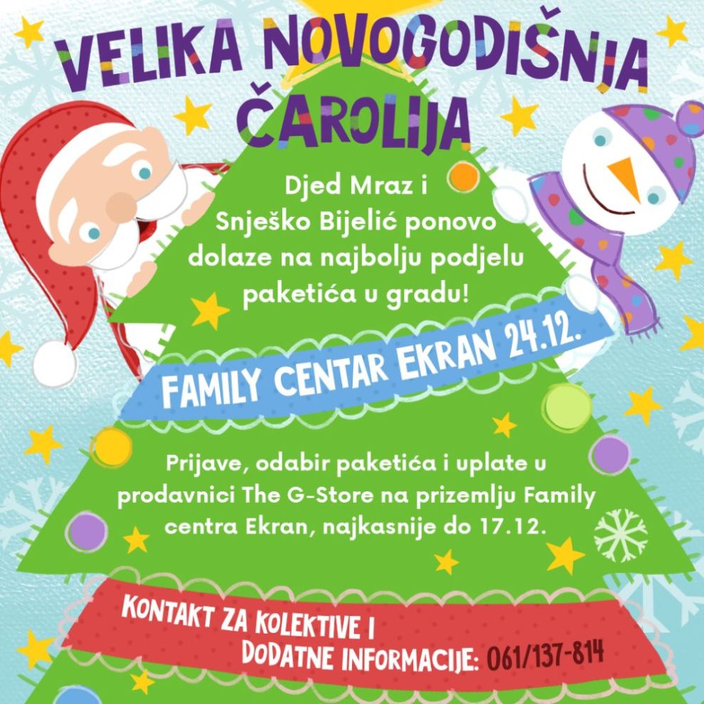 Djeda Mraz i ove godine dolazi na najbolju i najveću novogodišnju čaroliju u gradu. Gdje? Pa u Family centru Ekran, 24.12.2022. godine. Djeda Mraz ovaj put dovodi i Snješka Bijelića. Ko je ih (ne)zgode čekaju na putu do našeg grada? Dođite i saznajte.