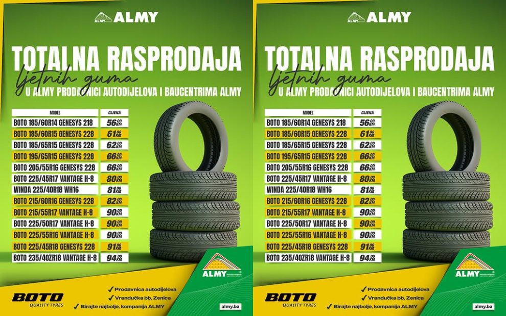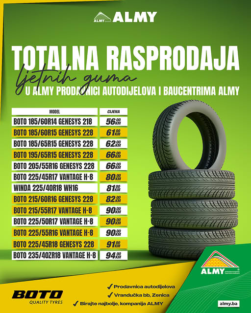 Velika rasprodaja BOTO ljetnih guma u ALMY prodavnici autodijelova i baucentrima ALMY