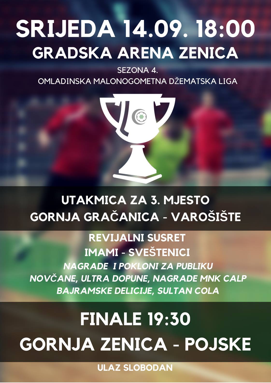 Veliko Finale Džematske lige – srijeda od 18h u Areni – Finale koje smo svi čekali – Nakon 1900 odigranih minuta u 4. sezoni, došao je red i na dugo očekivano finale. U srijedu, 14.09.2016. od 18:00 na centralnom terenu gradske Arene počinje vjerovatno najiščekivaniji futsal događaj u Zenici ove godine. Posjetioci će moći da uživaju u kremi omladinske zeničke futsal scene kroz dvije takmičarske i jednu revijalnu utakmicu.