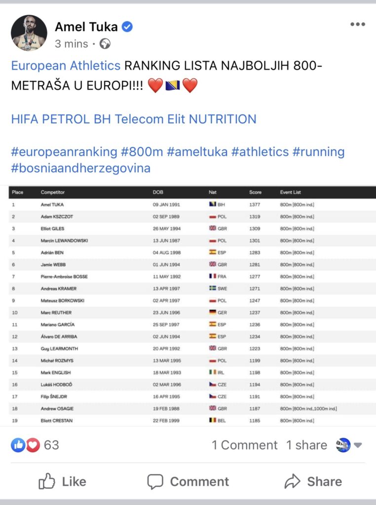 Veliko priznanje Evropske atletske asocijacije za Amela Tuku- Bosanskohercegovački atletičar Amel Tuka nalazi se na prvom mjestu nove rang liste najboljih trkača na 800 metara u Evropi, saopćila je Evropska atletska asocijacija.