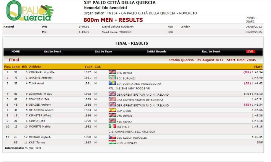 Amel Tuka 3. u Italiji sa najboljim rezultatom sezone, 1.44.62 – Na međunarodnom atletskom mitingu “Palio Città della Quercia”, koji je održan večeras (utorak) u italijanskom Roveretu, poznatijem kao Memorijal Edo Benedetti, naš Amel Tuka postigao je najbolji rezultat sezone.