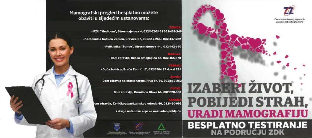 Izaberite život, pobijedite strah – obavite besplatan mamografski pregled u zdravstvenim ustanovama ZDK, slogan je kojim Institut za zdravlje i sigurnost hrane, u saradnji sa partnerima, Zavodom zdravstvenog osiguranja i Ministarstvom zdravstva, te zdravstvenim ustanovama u Zeničko-dobojskom kantonu provodi od kraja juna akciju besplatnog pregleda dojke mamografskim pregledom.