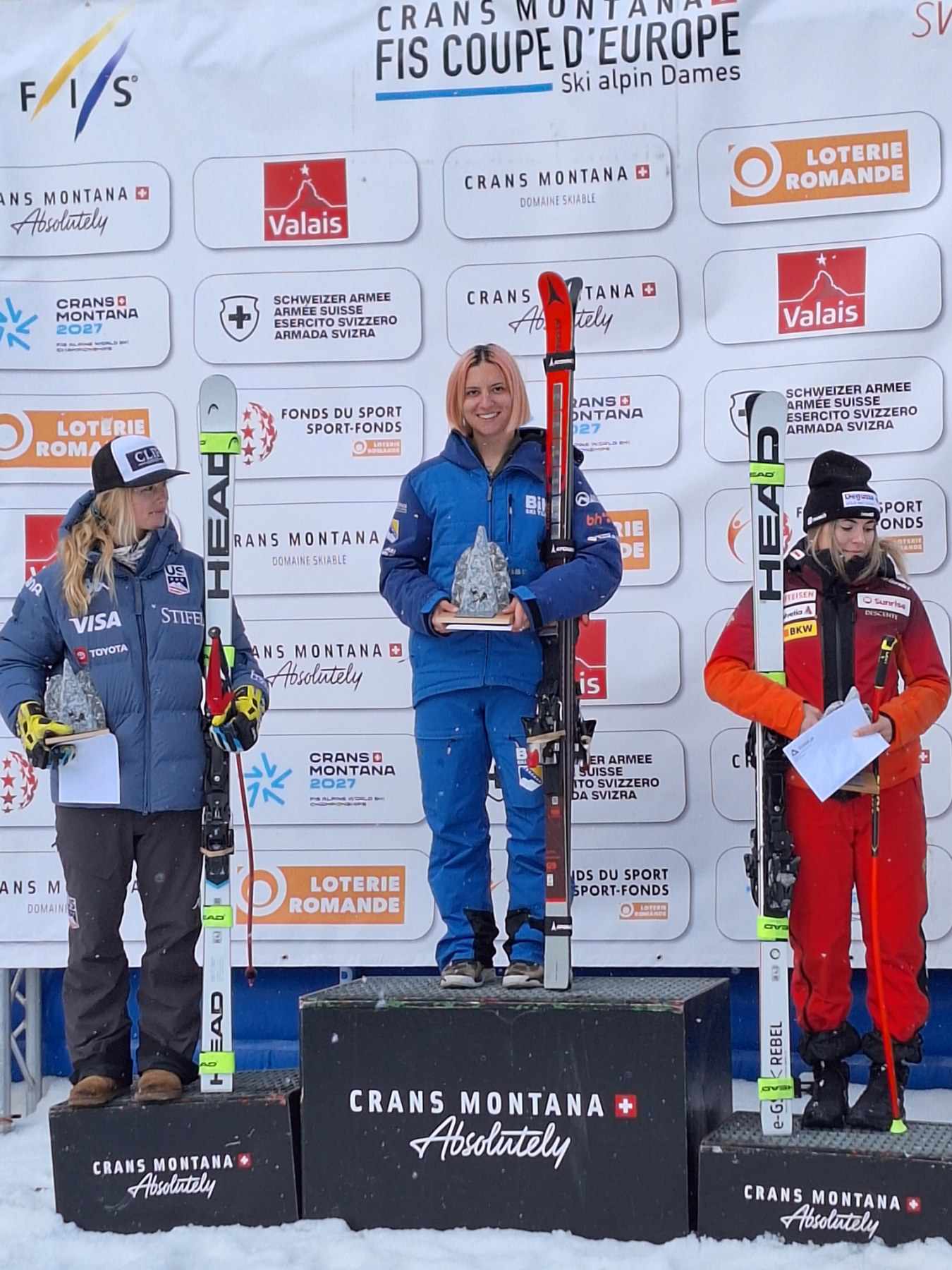 Elvedina Muzaferija (24) ispisala je danas, u Crans Montani, zlatnim slovima pobjedu u spust utrci Europa kupa. Švicarsko skijalište, na kojem je prije godinu osvojila srebrnu, prvu historijsku medalju za Bosnu i Hercegovinu ikada, Muzaferija je danas u drugoj utrci savladala s vremenom 1:08.12  i iza sebe ostavila Triciju Mangan (USA) te domaću  Deliju Durrer. Na četvrtom mjestu završila je slavna Čehinja Ester Ledecki koja je za bh.skijašicom kasnila 33 stotinke.