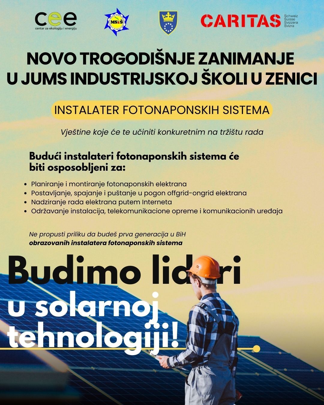– Uvođenje novog zanimanja pokazuje našu posvećenost praćenju potreba tržišta rada i daje adekvatan odgovor na zahtjeve koji se u tranformaciji na obnovljive izvore energije postavljaju pred našu zemlju. Učenici koji završe svoje obrazovanje i steknu kvlifikaciju za zanimanje Instalater fotonaponskih sistema bit će osposobljeni da montiraju fotonaponske sisteme, postavljaju električne instalacije i spajaju sve komponente, a takođe će se moći brinuti i za njihov nadzor, redovno održavanje i otklanjanje kvarova. Nastavu će voditi tim stručnih profesora koji je prošao i specijalizovanu obuku – rekao je Selvedin Botić, direktor JUMS Industrijska škola Zenica.